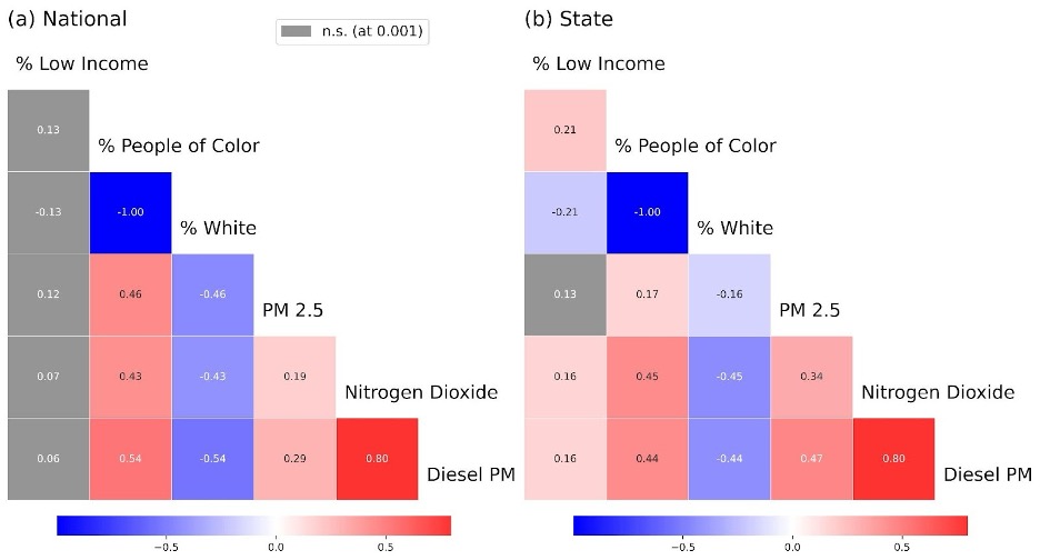 Figure 2 shows Pearson’s rank correlations of demographic and air quality variables for national and state percentiles of Census block groups within one mile of data centers, respectively. Statistically insignificant values (at p>0.001) are displayed in gray. In Census block groups within one mile of data centers, we found that the rank for percent people of color (POC) is positively associated with air pollution, namely PM2.5, NO2, and diesel PM, which are statistically significant at p<0.001. On the contrary, the rank for percent white is negatively associated with these air pollutants in both national and state contexts. For national ranks, we did not find a statistically significant association between low income percentage and air pollution near data centers. However, we did find statistically significant positive associations at the state level between low income communities and nitrogen dioxide and diesel particulate matter.