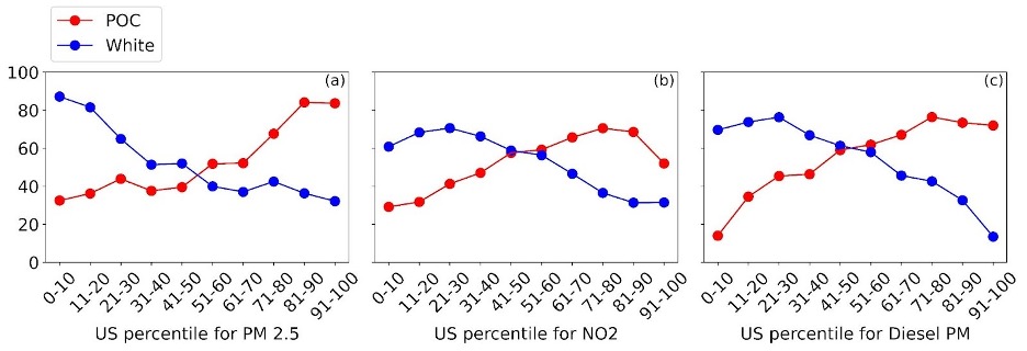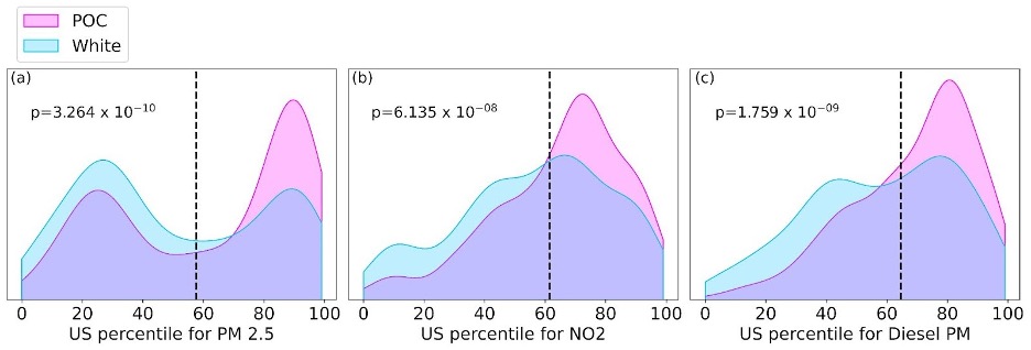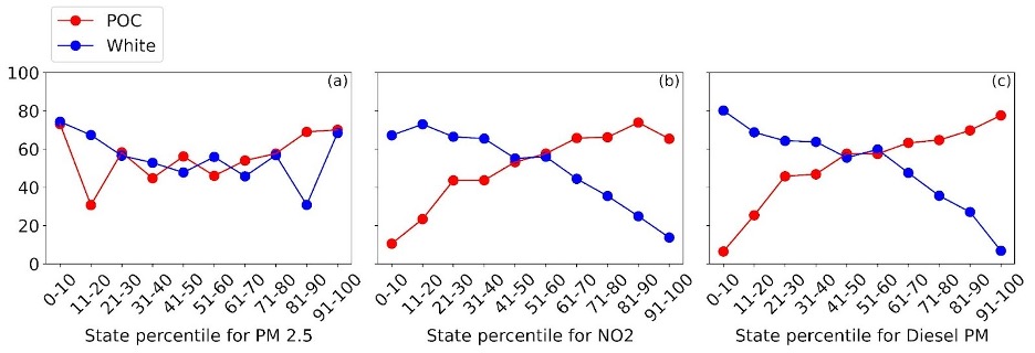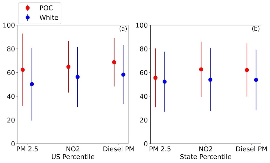 Figure 3 shows race-weighted means and standard deviations for (a) national and (b) state percentiles of PM 2.5, NO2, and diesel PM. All differences between POC and white across air quality metrics in national and state contexts are statistically significant at p<0.0001, according to a two-sample t-test. We find that both groups tend to be atypical relative to national and state pollution levels, but people of color near data centers tend to experience higher air pollution rates compared to their white counterparts. This trend is less pronounced at the state level when comparing air pollution levels to statewide values.