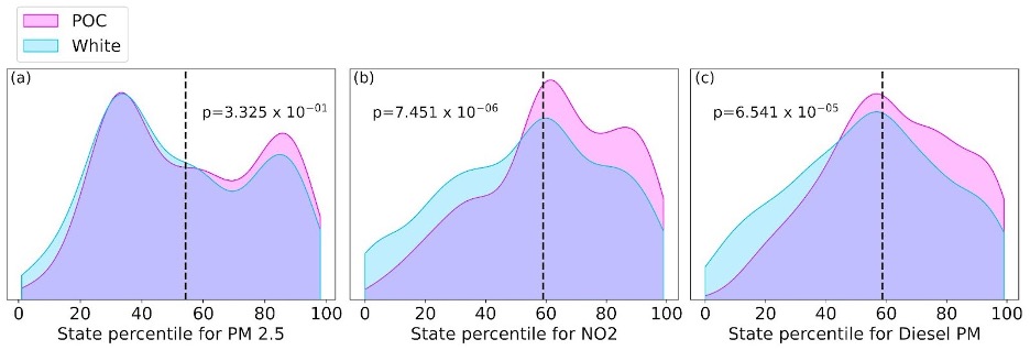 Examining Figure 5, we find that the PM2.5 burden in state contexts is similar for both racial groups: The peak of the distribution falls below the average state percentile for PM2.5 for the sample, but there is still a large number of both white and Black residents in the sample falling above the 80th percentile of PM2.5 in their respective states (indicated by a second peak in the distribution on the right). Moreover, people of color disproportionately face higher NO2 and diesel PM. In fact, there seems to be a greater burden of NO2 when considering state percentile ranks. For diesel PM, there is slightly less burden compared to the national level, but there seems to be a number of communities at the highest exposure levels (e.g., above the 90th percentile).
