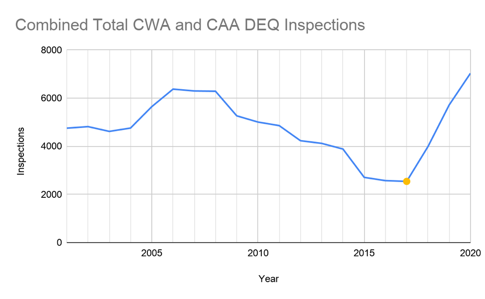 This is a surface-level analysis of trends in a district that could be impacted by many other factors; it’s possible that the timing with Regan’s tenure is incidental, and this bears further investigation. Nonetheless, the rise in inspections in North Carolina under Regan’s tenure as Secretary of the DEQ is promising.