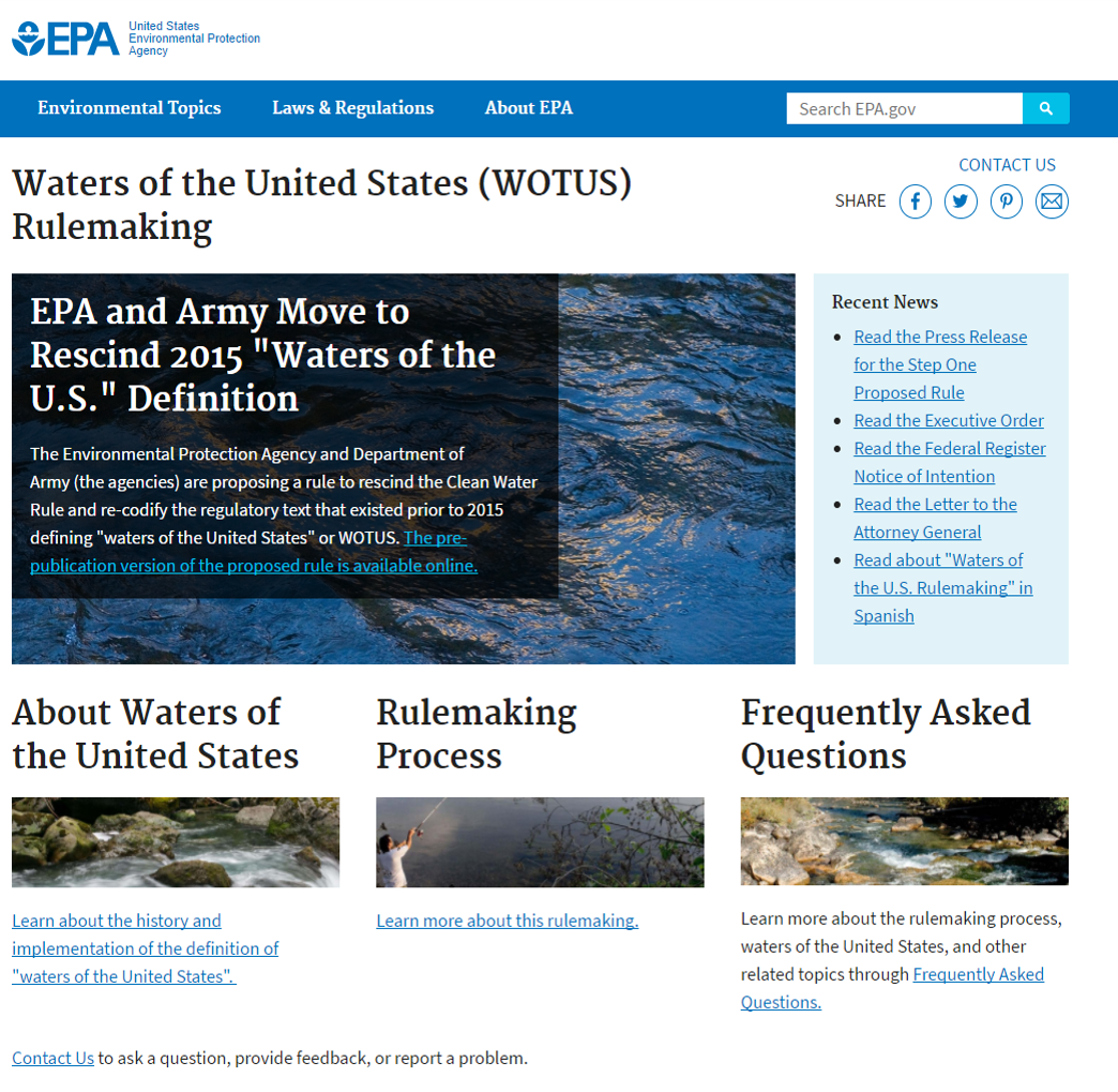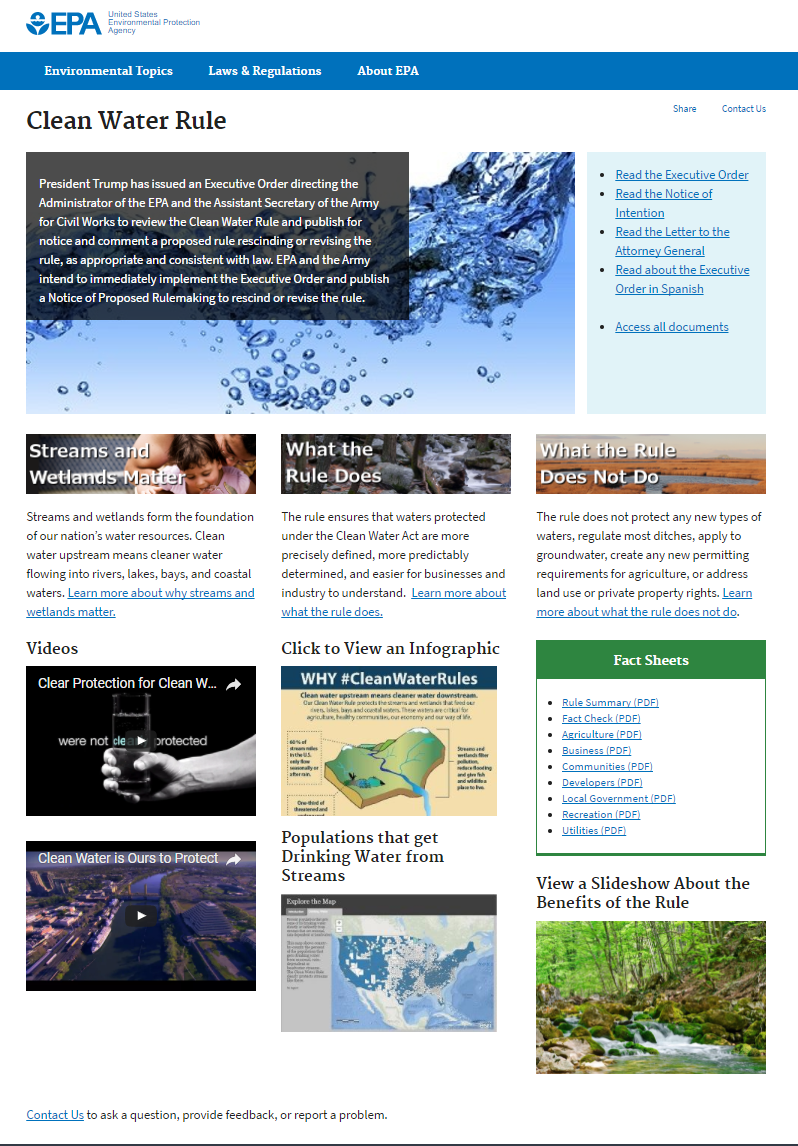 The EPA’s new website instead focuses entirely on the history of the definition of WOTUS and actions resulting from President Trump’s Executive Order 13778 requesting the review of the Clean Water Rule’s definitions. The new website, conspicuously avoiding the term clean water in its name and the general topic of clean water, does not include valuable resources that were previously available to the public about the benefits of streams and wetlands, influences on water quality, or basic hydrology. Among the resources removed from the website is a series of factsheets describing the importance of the Clean Water Rule to various stakeholders, an interactive map visualizing “populations that get drinking water from streams,” and a page about the value of protecting streams and wetlands. It is unclear from the news release or new WOTUS website why the additional pages based on the executive order were not simply added to the previously existing, now removed, Clean Water Rule website, such that the plethora of resources there would remain accessible to the public.