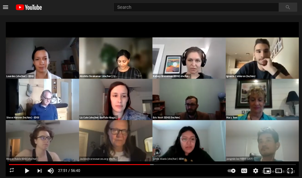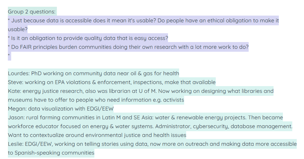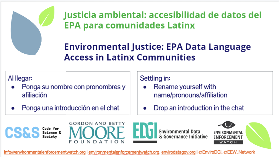Using funding from Code for Science & Society (CS&S), EDGI has developed and implemented standards for event accessibility. Specifically, our Environmental Enforcement Watch (EEW) team has developed tools aimed at making our event—including the tools, language, and data we use at events—as accessible to the public as possible. At EEW events held this spring, this included everything from using open source data tools like Jupyter Notebooks, live captioning, having live Spanish translation, and hosting a break room during our Zoom events. There is no one way to make an event accessible; attendees of different events, as well as the events themselves, have unique accessibility needs.