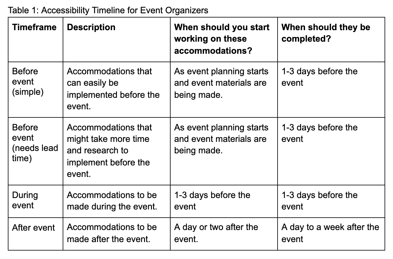 Below, we’ll break down accommodations by type, organized according to an event organizer timeline described in Table 1: