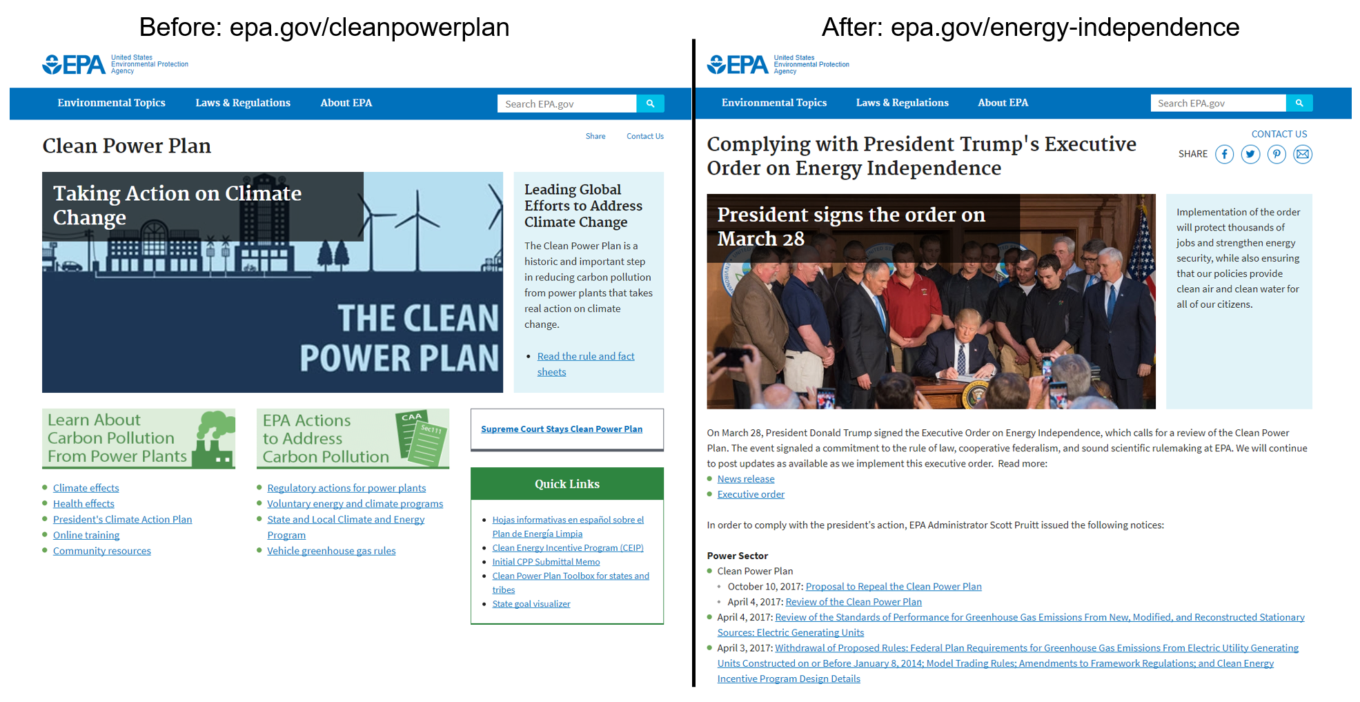 During the same set of EPA website removals, the website for the Clean Power Plan was itself removed and its URLs began redirecting to a new website about implementing President Trump’s executive order. While the previous website hosted resources for the public to understand the Clean Power Plan and for states to develop emissions plans, the new website links to the Federal Register, the order notice, and related news releases, but provides minimal informational resources directed at communicating the significance of the policy shifts to the public. The previous website linked to Spanish language Web resources, like Clean Power Plan facts sheets and community resources, which were also removed without being archived, likely as a result of the same errors mentioned above.