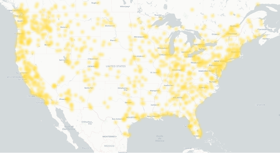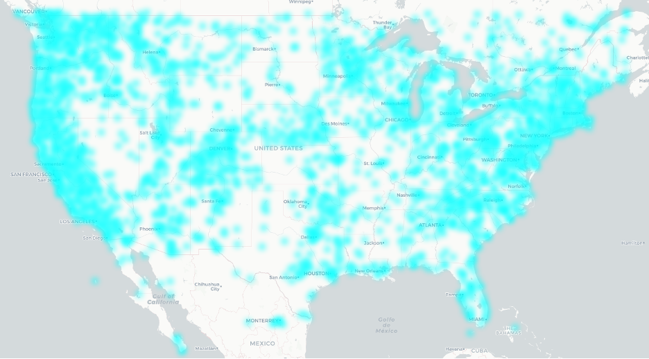 To demonstrate the need for community access to air quality data, we compared spatial heat maps of the distribution of AirNow versus PurpleAir monitors. Heat maps are typically used to visualize how data is concentrated spatially by using color gradients. We used a monochromatic color scheme for each sensor type to focus on geographic coverage. Figure 1 shows AirNow monitors’ coverage of particulates 2.5 microns or larger (PM2.5) in the contiguous US on July 13, 2025 (we used this same date for all AirNow maps).