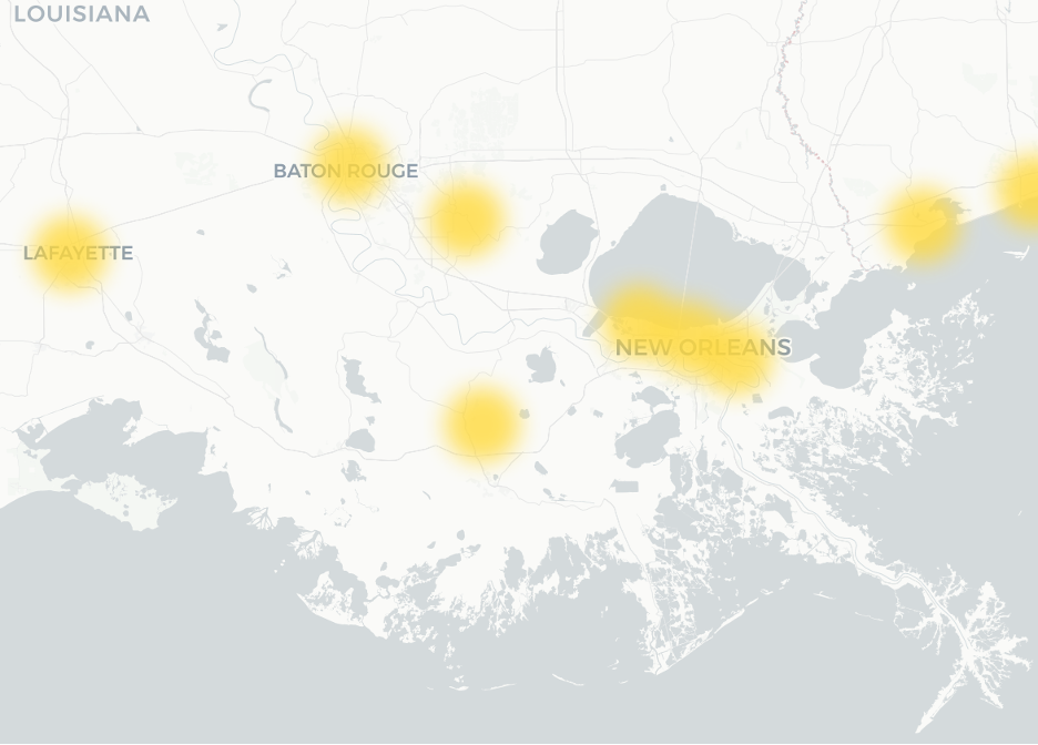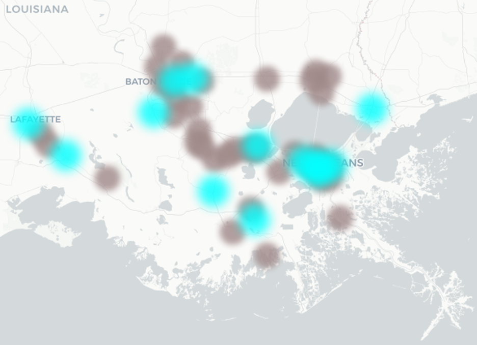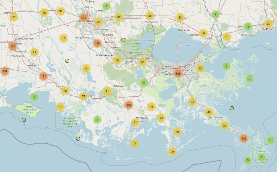 Next we zoomed in on a specific area to illustrate how data (or missing data) can tell a story. Below is a closer look at Southeast Louisiana, including major cities such as Baton Rouge, Lafayette, and New Orleans. This area also includes the infamous “Cancer Alley” (named for the presence of approximately 200 polluting fossil fuel and petrochemical facilities) lining the banks of the Mississippi River from Baton Rouge to New Orleans. Figure 3 shows AirNow’s coverage of the area.