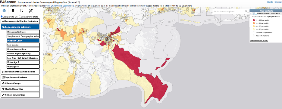 With a population of approximately 23,000 people today, Plaquemines Parish remains ethnically and ecologically diverse today. French-speaking Cajuns, Isleños from the Canary Islands, African Americans, and Houma, Chitimacha, Choctaw, and Atakapa-Ishak/Chawasha are some of the groups that live in Plaquemines, and from which the contemporary residents descend.6Zviers, 2024; https://fpcclouisiana.org/; https://native-land.ca/. Though the US Census shows that the population of Plaquemines Parish is predominantly white, demographic maps of the Parish show a segregated Black rural and white urban divide. The most densely populated part of Plaquemines Parish is the “upper Parish” which is close to New Orleans and predominately white.7People of Color in EJScreen refers to anyone who is not white, where “white” includes people who list their race as white and their ethnicity as not Hispanic. The more rural “lower parish” area, especially the east bank of the Mississippi River, are predominantly people of color (Figure 9) and disproportionately Black as compared to the rest of the state or Parish. The lower parish area is also home to the mouth of the Mississippi River, and there is no shortage of CAA-regulated facilities (see Figure 5).