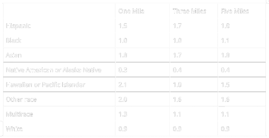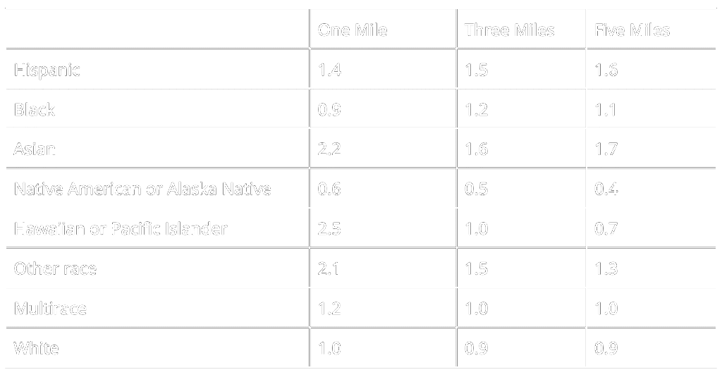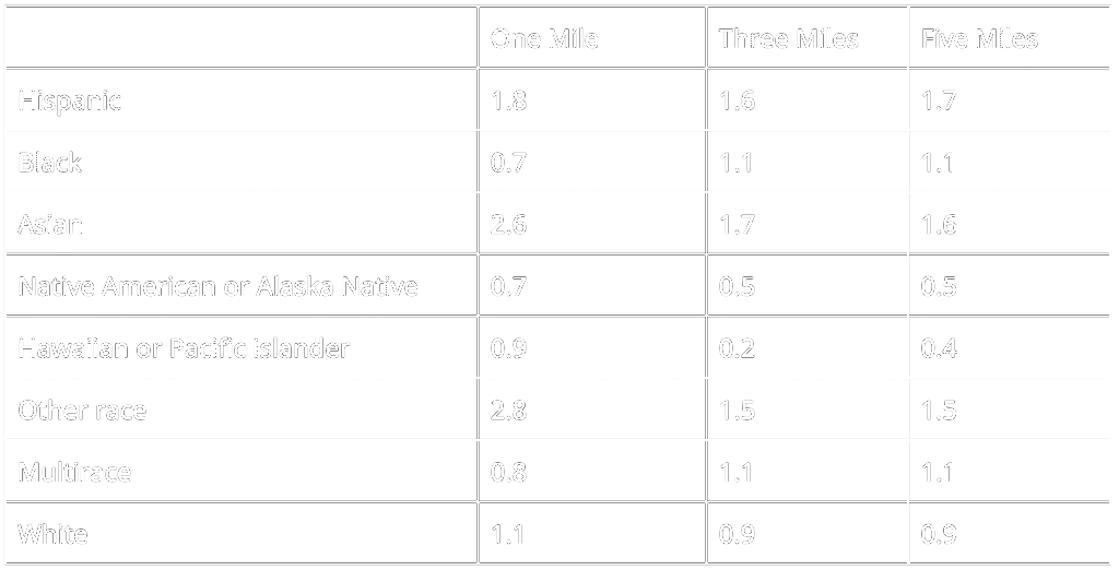 Table 2 indicates that within one mile of AirNow monitors, the population is slightly disproportionately white relative to the state (1.1), while Black communities are underrepresented (0.7). This is essentially inverted as the search area is expanded from one to three to five miles. With both PurpleAir and AirNow, Indigenous people (“Native American or Alaska Native”) are disproportionately underrepresented as compared to the statewide population.